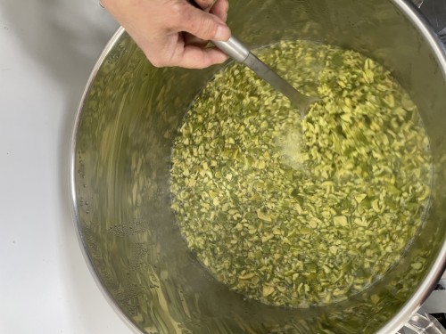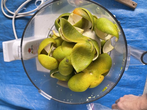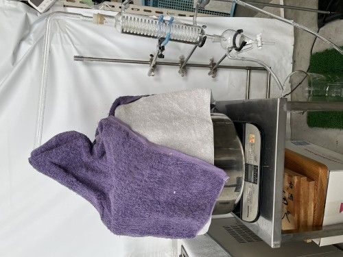 タンカン摘果の果皮。手剥きで果皮を剥いた状態で冷蔵で届いた。フードプロセッサーで5回粉砕し蒸留釜へ。加水 12L 粉砕してもべとべとした感じはなくさらさら。釜をバスタオルなどで保温すると釜の中に落ちてしまう蒸留水を上がりやすくする。ミカンジュースのような香り。オイルもたくさん採れた。抽出率2.7%