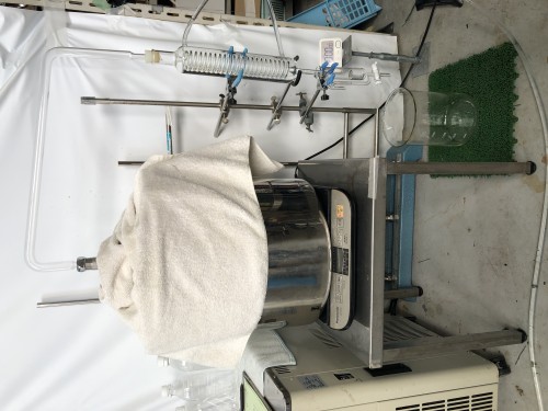 ヨモギのベビーリーフ冷凍で送られてきた。ヨモギの若葉なのか?5kg送付分のうち約4kg使用。ヨモギはオイルが少ないため45mlオイルセパレーターを使用。青いオイルが確認できるが、ごく少量の為上澄みを取り分けた。ウォーターは、ヨモギ餅の香り? 蒸留時間120分 加水6L