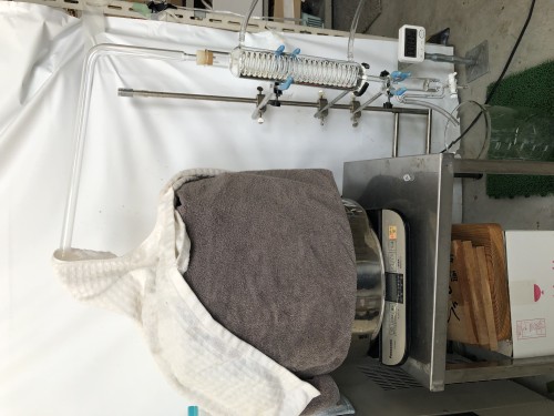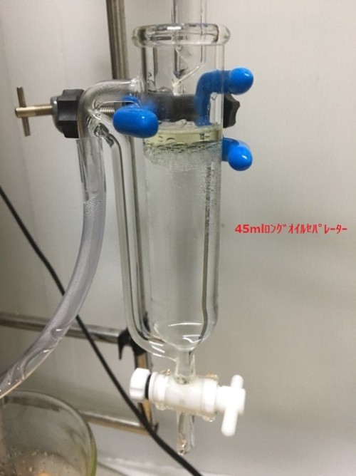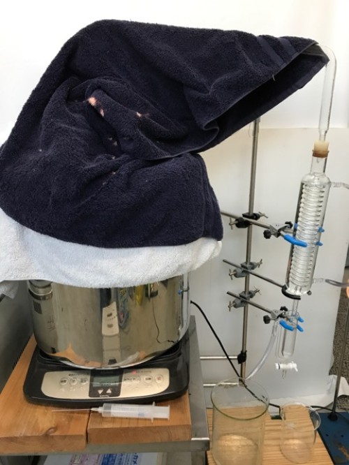 月桃の葉(フレッシュ)の蒸留です。スチーム蒸留 加水は 6 L 。月桃は精油が少ないので新商品の45mlロングオイルセパレーターを使用しました。寒くなってきたため連結管のところまで保温用のタオルをかけました。5kgの月桃からわずか3mlの精油 とても貴重な精油です。ウォーターは濃厚な香りです。