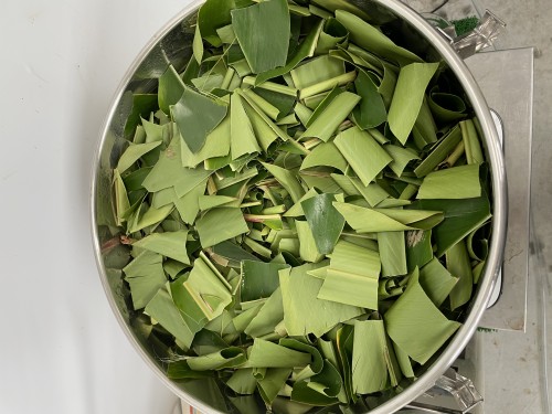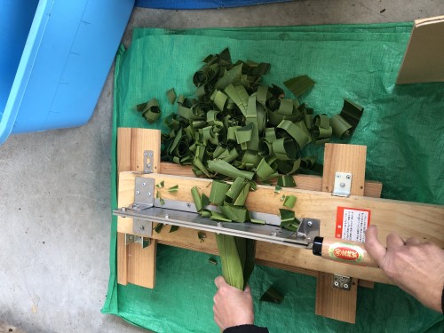 月桃の葉フレッシュの蒸留。3箱届いたが全部入れられた。3kg位までは入りそう。葉を4,5cm程度にカットしてから蒸留釜へ。葉をカットするといい香りがする。精油7mlとれた。