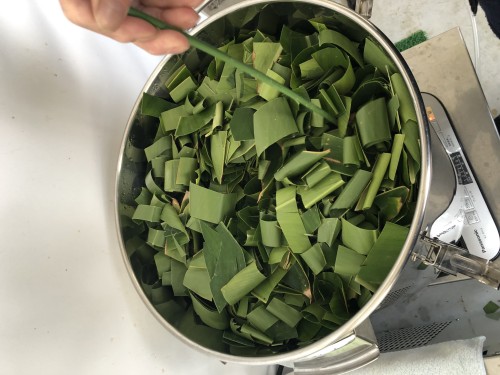 月桃の葉の蒸留。ハサミで4、5cmくらいにカットしてから蒸留釜へ。36L釜満タン入れた。45mlオイルセパレーター使用。