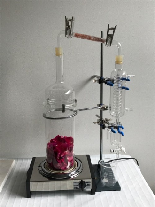 冷凍のダマスクローズ(ガク付)を煮出し蒸留。加水は5L。銅ウールアタッチメントを使用。この程度の量では精油は採れないがローズウォーターは採取できる。ローズの蒸留は銅の使用が有効。