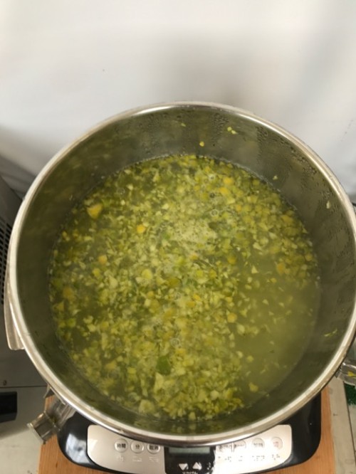 全体量7310g 果皮のみ800g ピーラーで皮むき1名55分。皮をむく時に出るオイルも無駄なく採取するため 水を張った容器の上で皮をむきます。剥き終わったら、その水も加水に加える。果皮のみフードプロセッサーで粉砕して蒸留釜へ。この材料では果皮のみあと3~4倍程度入る。加水15L。蒸留時間120分
