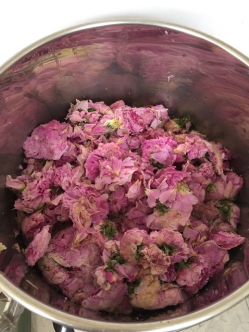 ダマスクローズ(冷凍)の蒸留です。ローズの精油にはローズオットーとローズアブソリュートがあり、水蒸気蒸留で採れる精油をオットー、溶剤抽出で採れる精油をアブソリュートと言います。ローズオットーの抽出率は約0.004%程度と言われ小型の蒸留器では精油を採る事はできませんが、ローズウォーターは採る事が出来ます。ローズウォーターの主成分は水に溶けやすいフェニルエチルアルコールでバラの香りの源でもあるためとても良い香りです。蒸留直後より少し寝かせると香りが落ち着き良い香りへとなっていきます。