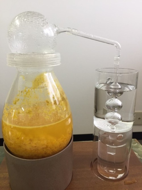 PureStiller miniでの蒸留です。夏ミカンの果皮をピーラーで手剥きし、フードプロセッサーで粉砕し水と一緒にフラスコへ入れ煮出し蒸留。加水は900ml。PureStiller miniでも4.5mlのオイルが採れました。蒸留時間60分。