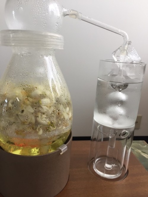 5月 ネロリが咲くこの時期だけのフレッシュネロリでの蒸留です。加水は300ml オイルは採れませんでしたが芳醇なネロリウォーターが採れました。