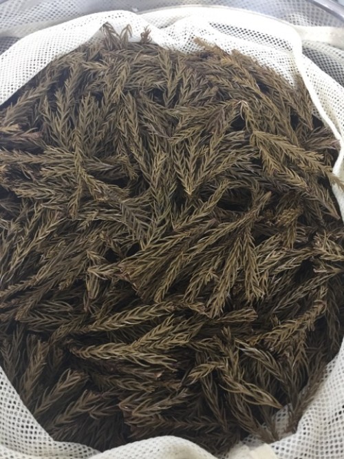 スギの葉(フレッシュ)をはさみでカットし蒸留。加水5.5L。蒸留時間150分。
