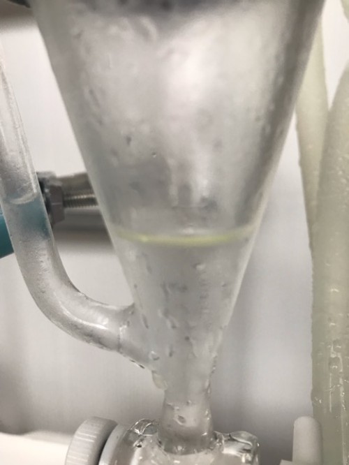 クロモジ枝葉(ドライ)枝葉チッパーで細かくなっている。布ネット使用。枝と葉を交互に入れ面にまんべんなく入れた。一時冷却23℃二次冷却6~7℃。0.08Mpa 釜内温度50℃程度。加水4L。蒸留時間130分