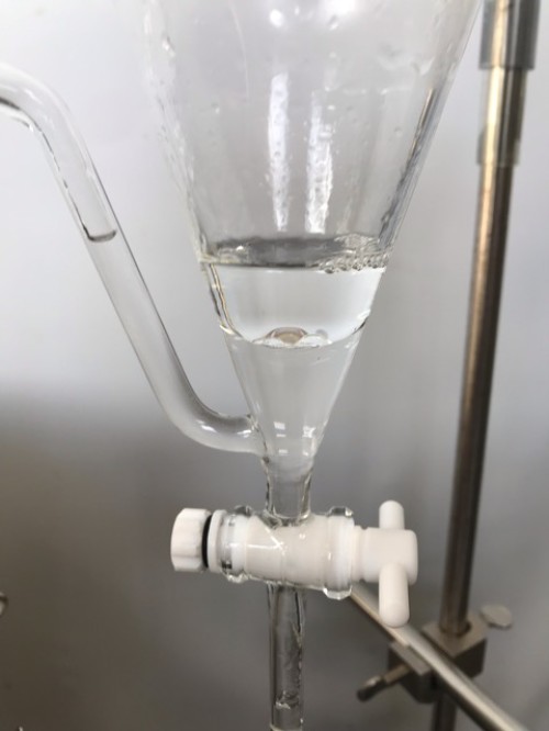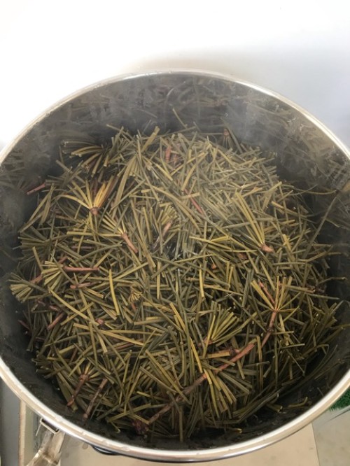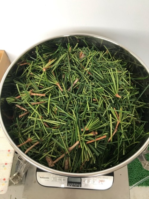 コウヤマキの蒸留。太い枝は除いて、葉・小枝ははさみで4~5cmにカットしてからスチーム蒸留。ヤニ?があるのかベタベタとくっつく。加水6L。蒸留時間は120分。精油は透明。