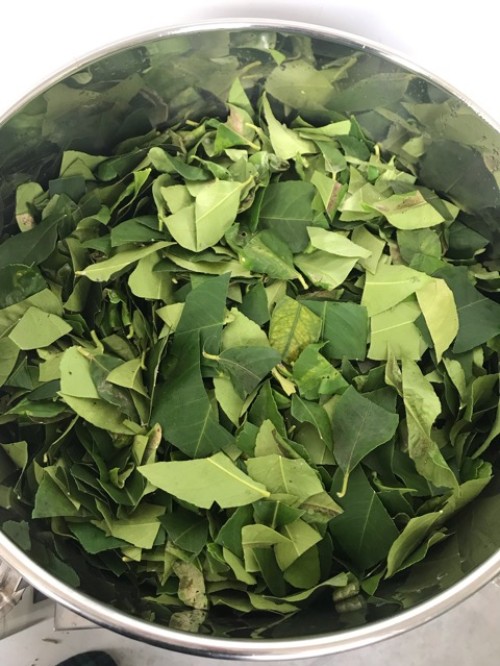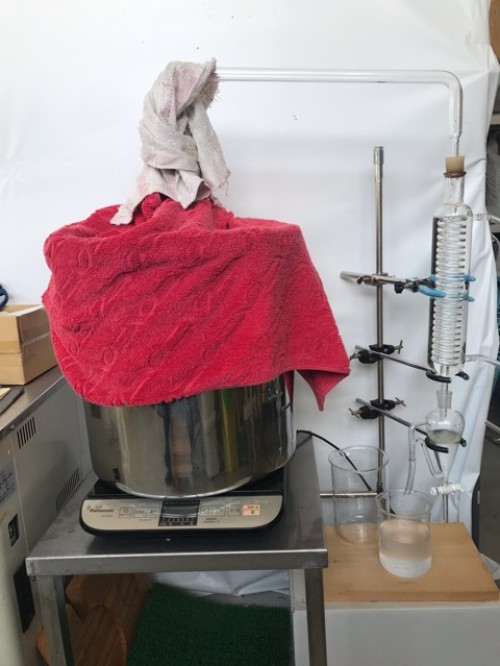 レモンの葉(フレッシュ)プチグレンの蒸留。葉をハサミで3,4cmにカットしスチーム蒸留。蒸留時間①0~30分と②30~60分の蒸留水は少し白く濁っている。加水6L。蒸留時間120分。オイルはグリーンよりもレモン様の香りが強めの爽やかな香り。