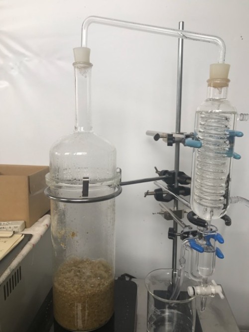 実の外側は香りは無いが皮をこすって中の種が見えると月桃の良い香りがする。種はまだ青い。フードプロセッサーで粉砕しLiteのIH仕様で煮出し蒸留。加水は800ml。蒸留開始最初の0~30分は月桃の葉の蒸留水よりも強い香り。30分~は月桃の葉の蒸留水の香りに近い。精油は極々僅か確認できる程度。