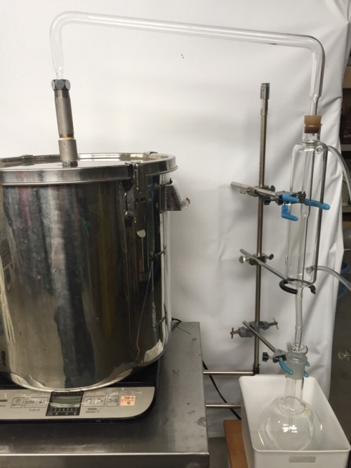 クスノキチップの蒸留。新鮮なのか送られてきた時からカンファーの香りがとても強かった。クスノキは、結晶化するので通常の蛇管式の冷却器ではなく直管の冷却器を使用する。直管冷却器を1L丸フラスコで受けて後からロートで結晶を濾過し分液ロートに蒸留水を分ける。濾過した結晶は紙にはさんで水分を取り除き結晶を取り分ける。結晶が多く直管冷却器の中にも結晶が溜まっていくので、冷却水は流さないで丸フラスコを冷やす。加水6.5L。蒸留時間90分。