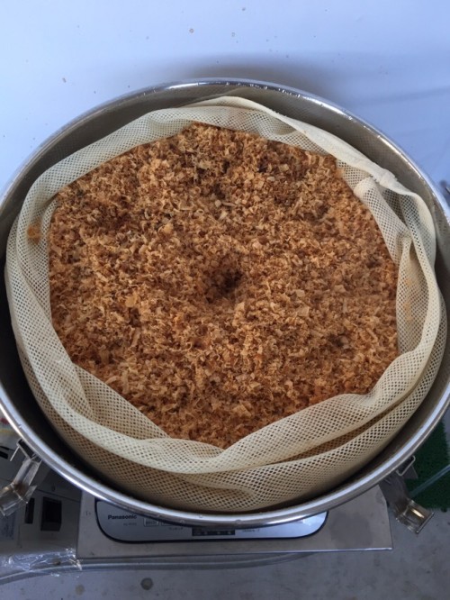古代ヒノキのオガクズ多少小さいチップも入っている。香り強い。しっとりしているので乾燥までは仕切っていない状態。30分でもすでにオイルがたくさん採れて1時間弱でいったんオイルを取り分けた。そのあともオイルが出続け150分まで蒸留した。ウォーターも香りが強く良い香り。