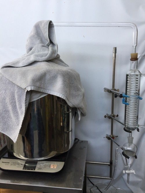 クロモジ枝のみと葉付き枝に分かれて送られてきた。一緒に混ぜて蒸留。枝葉3~5cmにカットしてから蒸留。作業時間1名90分。蒸留水・オイル クロモジの良い香り。始めの30分はあまりオイル出なかった。150分まで蒸留。