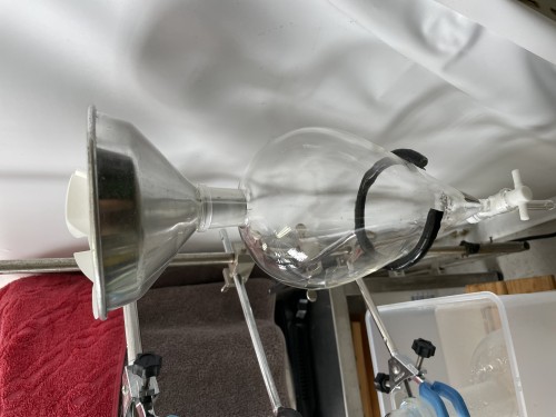 6/14(月)に黄河着。袋の外まで樟脳の香りがする。4日前にとってきたクスノキチップ。布ネット使用。直管冷却器+1L丸フラスコで二次冷却。一旦60分で丸フラスコにたまった蒸留水を分液ロートにかけ結晶を濾過する。蒸留時間100分。終了後丸フラスコ内の蒸留水と結晶を濾過する作業。丸フラスコのふちに結晶が付着しているのをフラスコをまわすと結晶がくっついて固まりとなってはがれていく。結晶だけを取り出し、ろ紙に挟んで水分をとる。