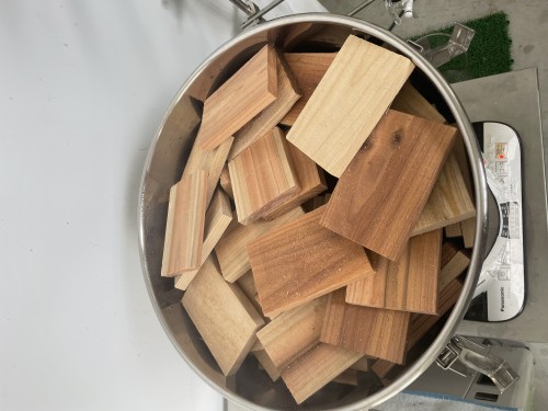 スギ板10cm角送付されてきたそのままの形で蒸留。釜の中に蒸気が通るように交互にきれいに並べて入れた。通常木部の蒸留は、チップ状やオガコの状態で行うが板の状態でも精油が採れるのか・・・木材が大きいので蒸留時間180分まで実施。板の状態でも少量だが精油が採れた。黄色い粘性のあるオイルが採れた。