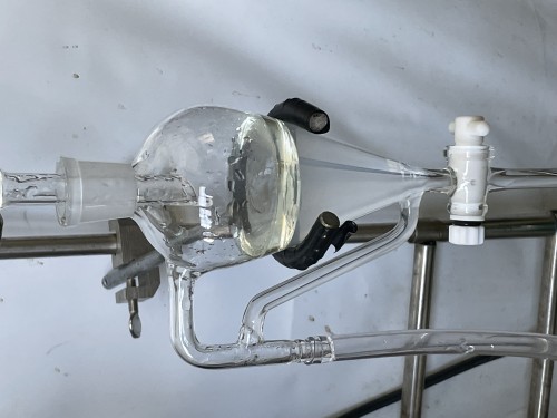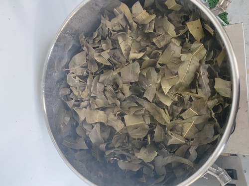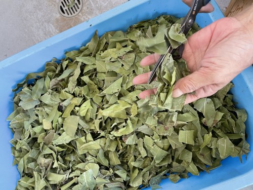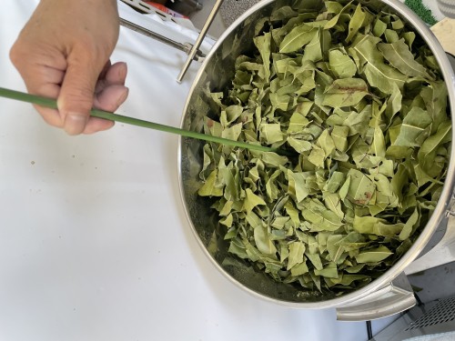 レモンユーカリの蒸留。葉自体の香りがとても強い。届いたと同時に周辺がレモン様の香りになった(シトラール?の香りが強い。)葉が細長いのでハサミで3,4cm程度にカットしてから蒸留釜へ。葉自体の香りは強いが蒸留中はそんなに香りは強くない。香りはレモン様でそんなにきつい香りではない。