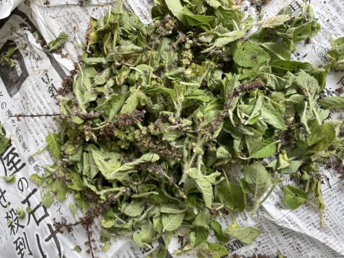 前日に到着したホーリーバジル(フレッシュ)。2日前に送付されたようでビニール袋に入れてあった為フレッシュなので蒸れて少し傷みもあった。到着後、広げて保管した。手にとると葉が落ちて茎だけになってしまう。葉と穂先をカットして蒸留釜へ3,660gで満タン。
