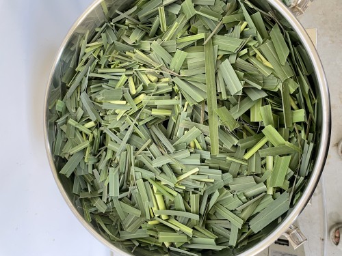 レモングラス(フレッシュ)の蒸留。きれいに束ねて送られてきた。茎部分もあり。4,5cmにカットしてから蒸留釜へ。送られてきた全量を釜に入れたが、若干詰め込み過ぎな感じはあり。なかなか蒸気穴をあけれないくらい詰まっている。4kg~4.5kgくらいが適量か。精油は良くとれている。香りも良い。