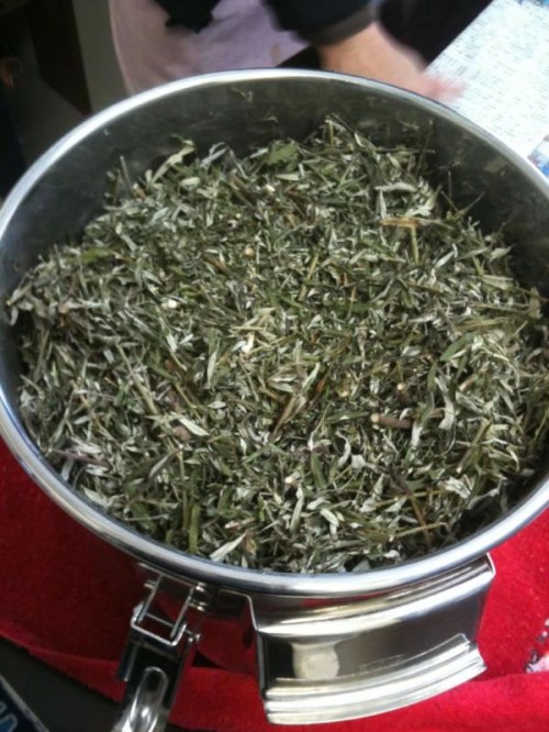 ヨモギ(フレッシュ)の蒸留です。ハサミで3~5cmにカットしてスチーム蒸留。ヨモギは抽出率が低いのでロングオイルセパレーターを使用。。うすいブルーの精油が採れました。香りはスーッとした香りです。加水6.5L。蒸留時間90分。