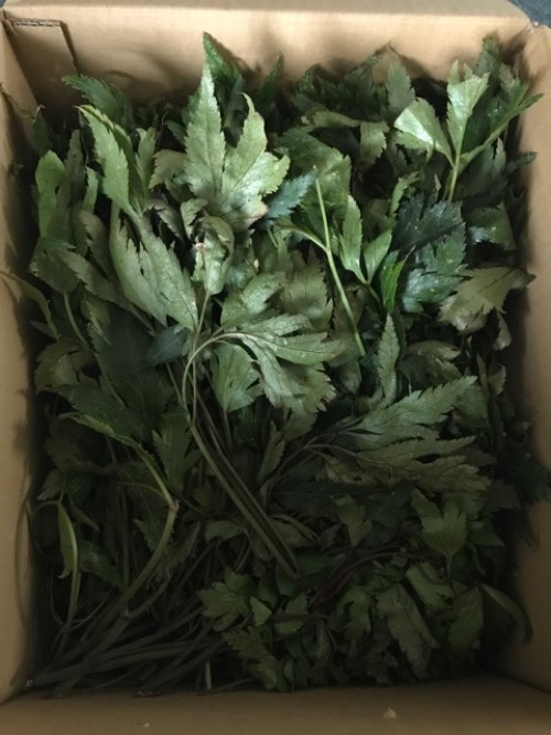 当帰トウキ(生)の蒸留。ハサミでカットし25L鍋で蒸留を行った。セロリの様な強い香り。精油も採れました。加水5.5L。蒸留時間120分。