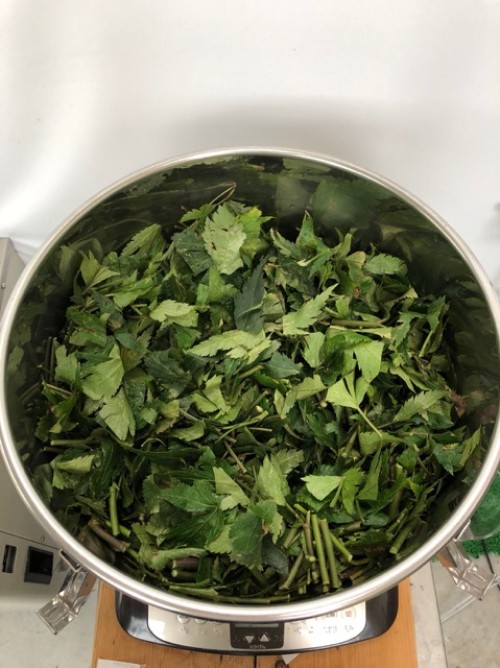 全体量3240g下の方の太い茎(650g)は除き、ハサミで3,4cmにカットしてからスチーム蒸留。(カットの所要時間1人で1時間15分)。加水6L。蒸留時間120分。葉がくっつきやすいので、3枚目の写真のように菜箸やお玉の柄を差し込んで蒸気の通り道を作っておく。黄色いオイルで粘性が強いせいか 冷却器の下段あたりにもオイルが付着して黄色くなっている。蒸留後暖かい蒸留水を流しても採れにくい。青じそよりも香りは穏やか。