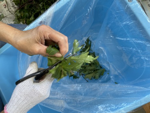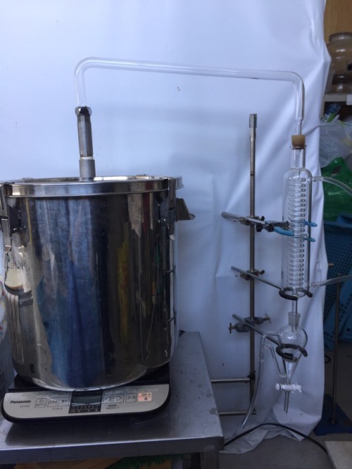 朝刈り込んだ大和トウキを持参された。加水の水も持参されて蒸留に使用。ハサミでカットしてから蒸留釜へ。大和トウキは抽出率が低いため45mlオイルセパレーターを使用。全草の長さが短い。精油もとれた。蒸留時間120分。加水6.5L