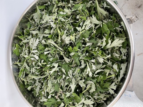 フレッシュのヨモギクール便で3箱(約8kg)届いた。大型カッターで4,5cmにカットしてから蒸留釜へ。1回を90分で終了し、残りの材料で追加蒸留。精油はオイルセパレーターに残し続けて蒸留実施。青色の精油が採れた。蒸留水は①0~30分までは香りが良い。