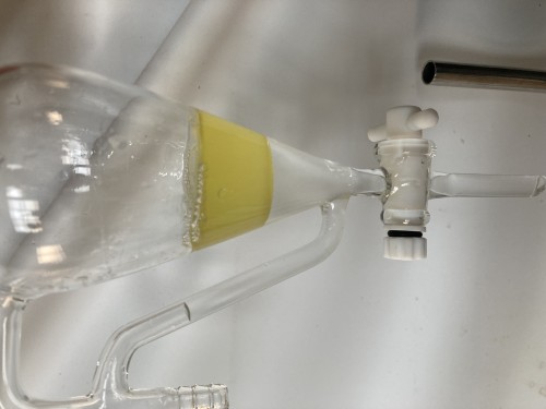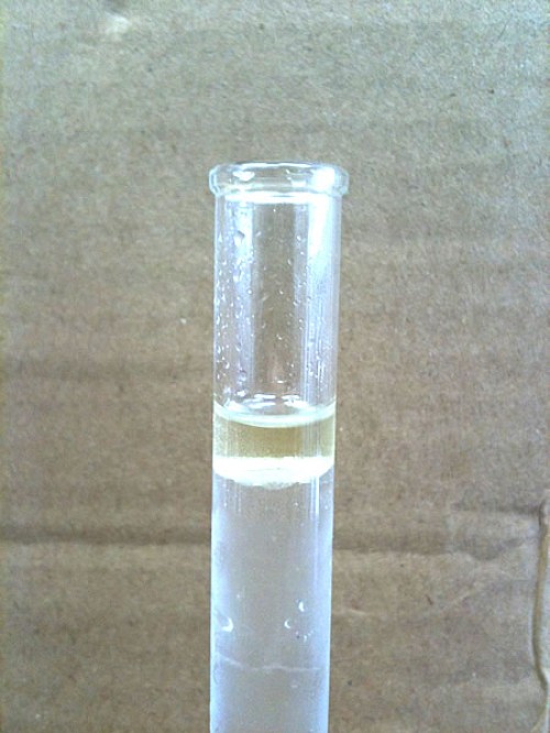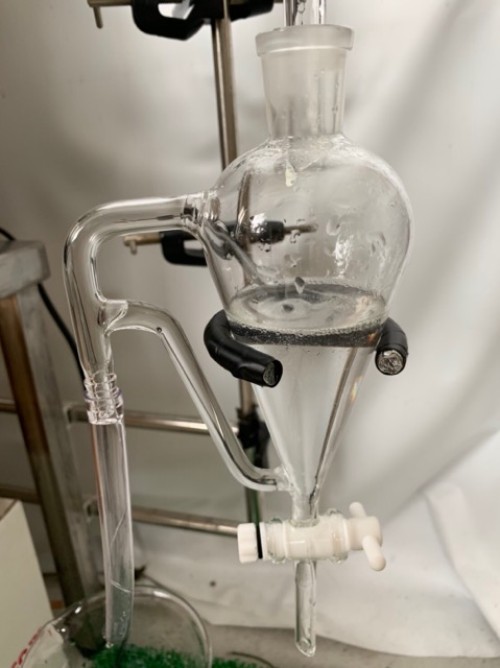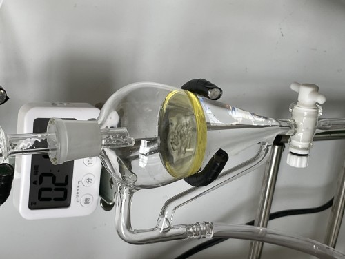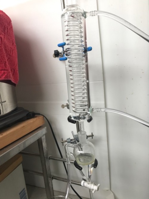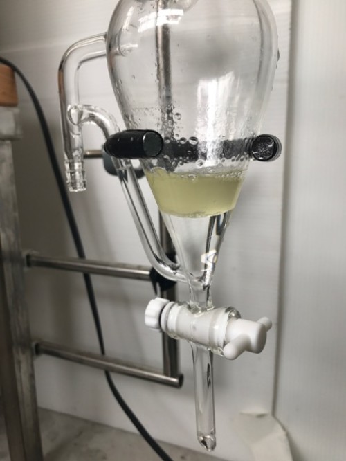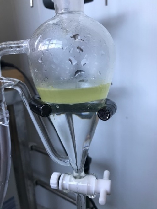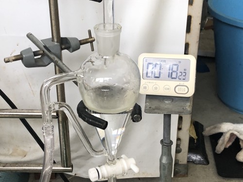 漆器のカンナクズ(ケヤキ)。黄色いオイル?冷却器にくっつく。最後冷却を止めて冷却器についているオイル?を流した。粘性強い、ウォーターも黄色く色がついている。とれたものは、オイル?オイル・蒸留水分析へ