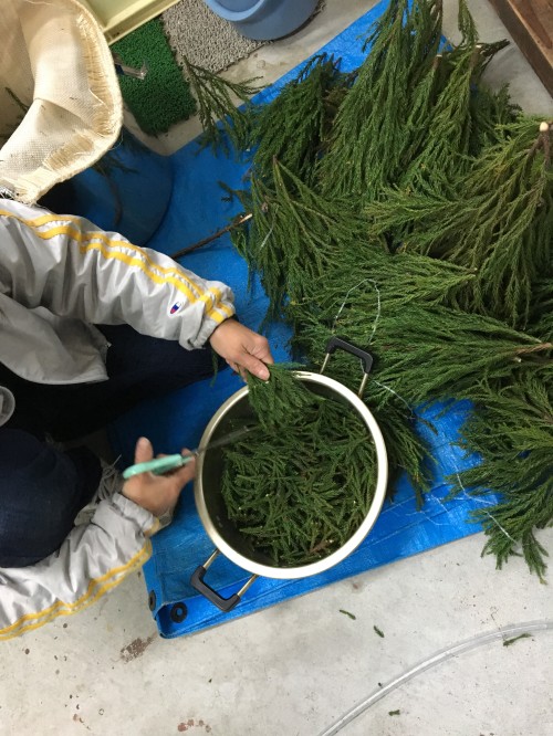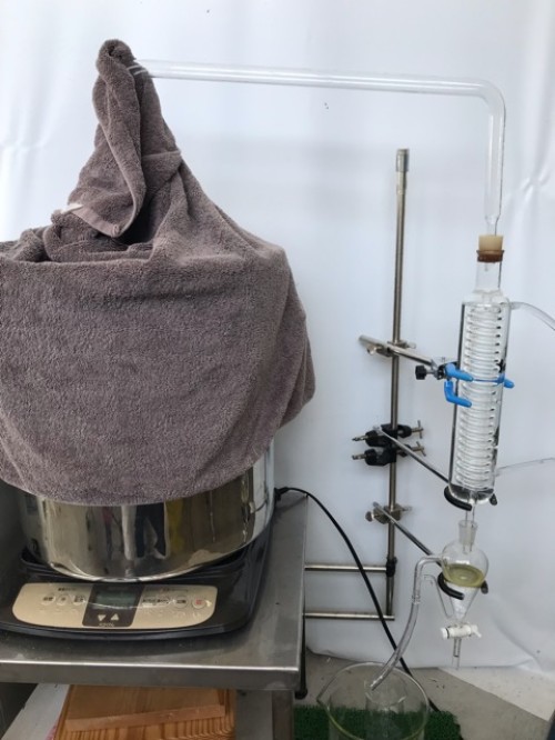 はさみで4~5cmにカットしてから蒸留。スギ花粉の時期だが、精油の香りはとても良い香り。加水6L。蒸留時間120分。