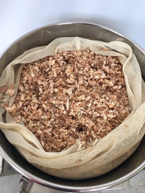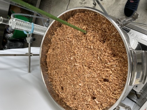 スギチップを布ネットにいれて36L蒸留釜へ入れる。樹木系は少しづつオイルがたまっていくので今回は180分蒸留しました。やや粘性のある黄色いオイルが採れました。加水6L。