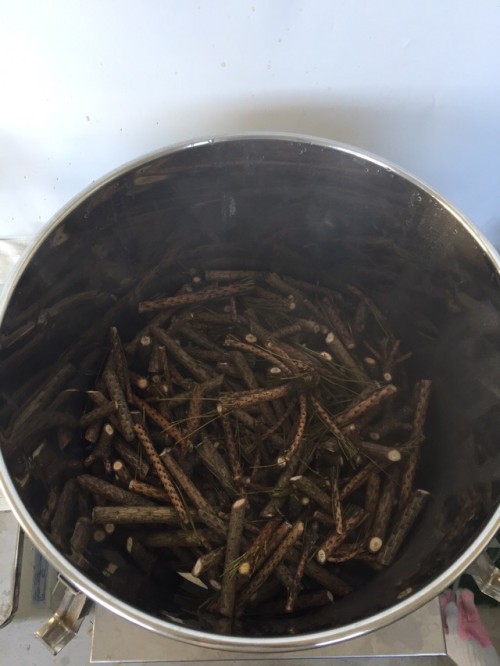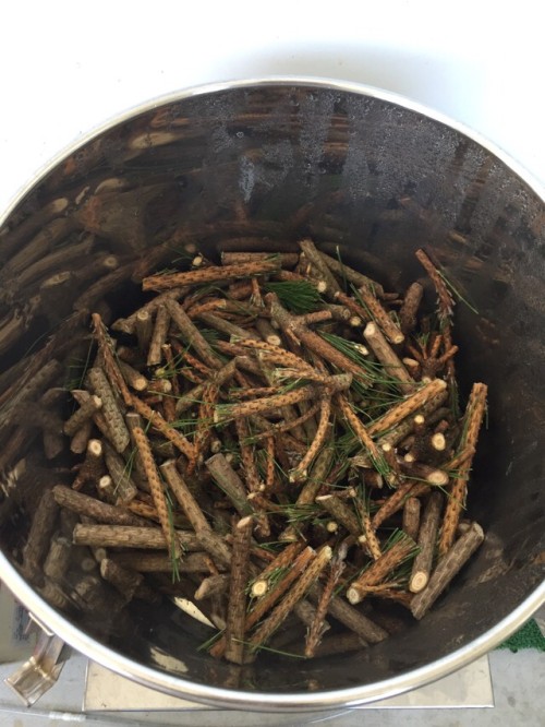 松の枝(木部)の蒸留。10~15cm程の枝。釜の半分程度の量。6kgくらいまではok。葉と同様透明な精油。葉の方がスッキリしている。
