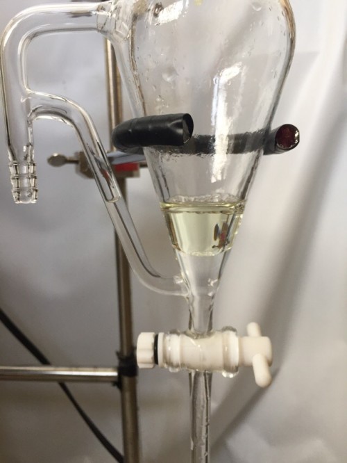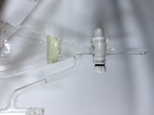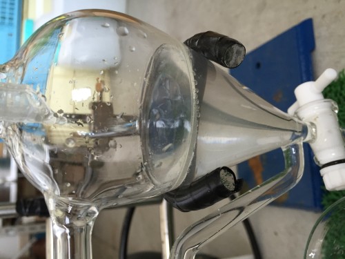 6/14(月)に黄河着。袋の外まで樟脳の香りがする。4日前にとってきたクスノキチップ。布ネット使用。直管冷却器+1L丸フラスコで二次冷却。一旦60分で丸フラスコにたまった蒸留水を分液ロートにかけ結晶を濾過する。蒸留時間100分。終了後丸フラスコ内の蒸留水と結晶を濾過する作業。丸フラスコのふちに結晶が付着しているのをフラスコをまわすと結晶がくっついて固まりとなってはがれていく。結晶だけを取り出し、ろ紙に挟んで水分をとる。