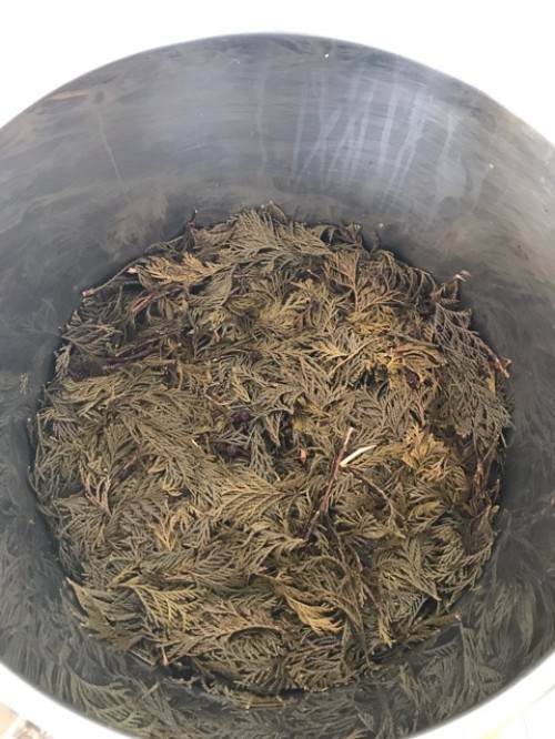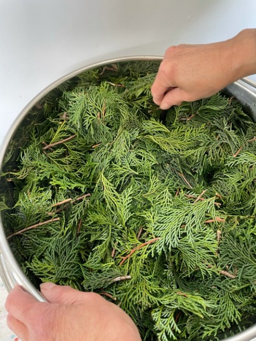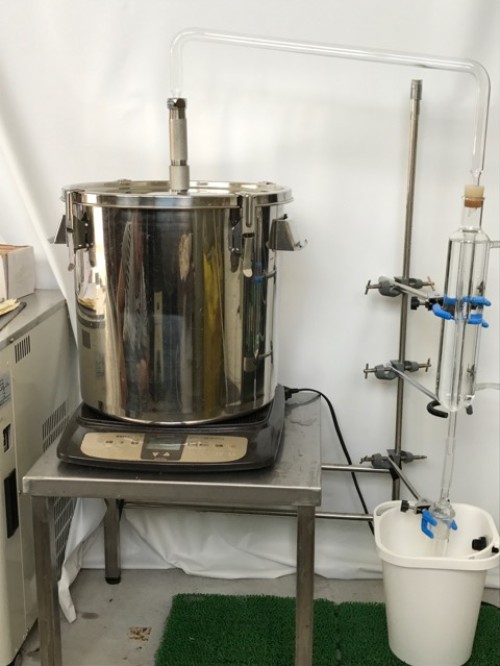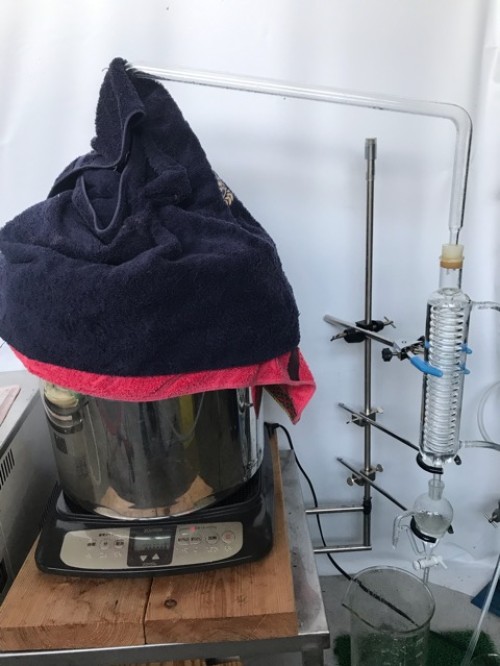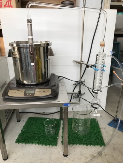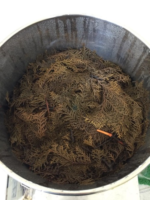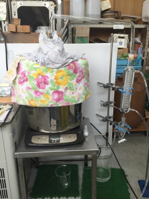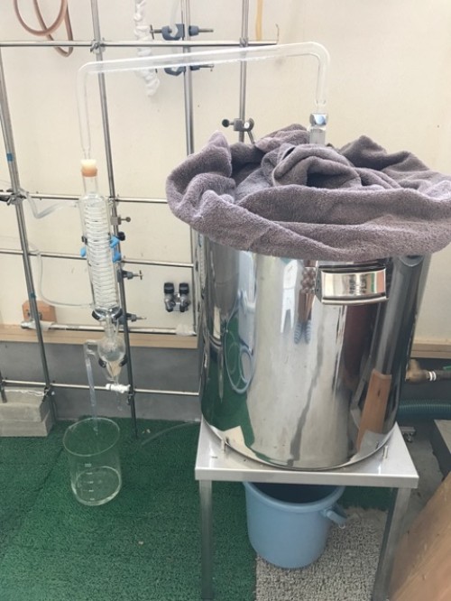 ヒノキの葉(フレッシュ)をスチーム蒸留。太い枝などはぬけて 葉をハサミで4~5cmにカットして蒸留釜に入れる。 釜の上部ををバスタオルなどで保温すると蒸気が連結管へ上がりやすくなり蒸留水が効率よく採れる。加水4L。蒸留時間120分。