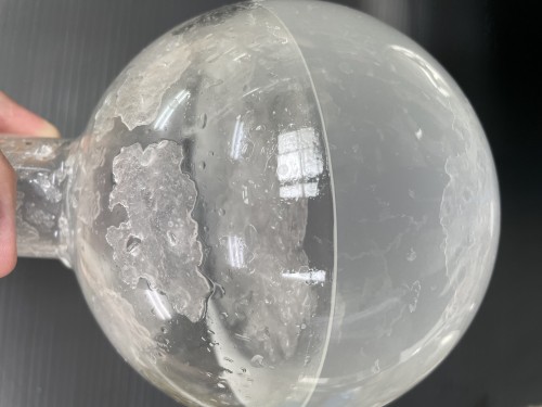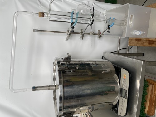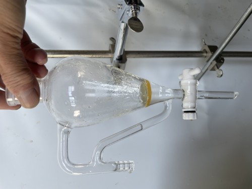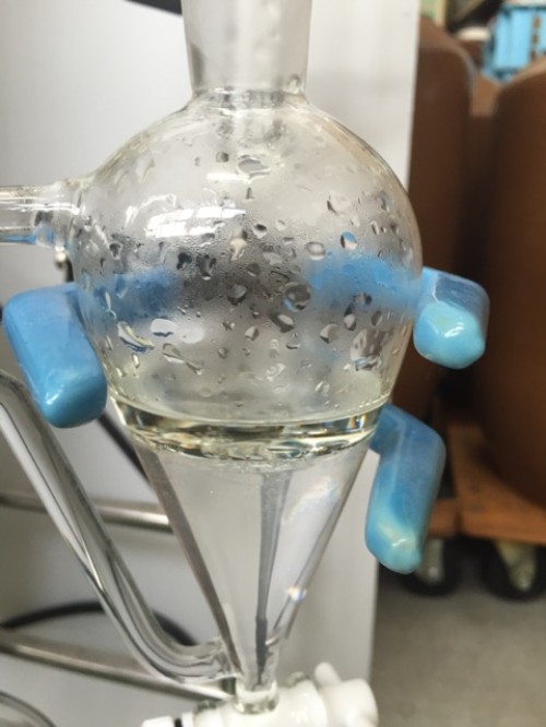 クスノキチップの蒸留。新鮮なのか送られてきた時からカンファーの香りがとても強かった。クスノキは、結晶化するので通常の蛇管式の冷却器ではなく直管の冷却器を使用する。直管冷却器を1L丸フラスコで受けて後からロートで結晶を濾過し分液ロートに蒸留水を分ける。濾過した結晶は紙にはさんで水分を取り除き結晶を取り分ける。結晶が多く直管冷却器の中にも結晶が溜まっていくので、冷却水は流さないで丸フラスコを冷やす。加水6.5L。蒸留時間90分。