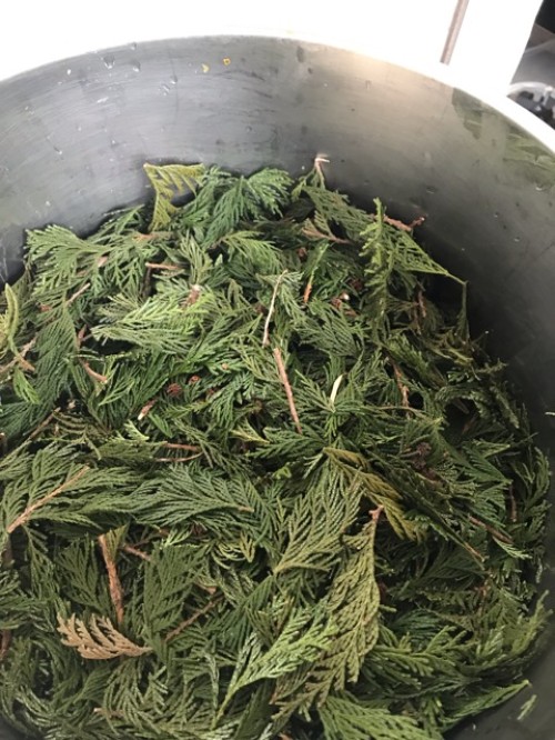 ヒノキの葉、小枝を蒸留しました。樹木系は材料をカットしてから蒸留釜に入れます。寒い時期は蒸留釜をバスタオルなどで巻いて保温すると蒸気が上がりやすくなり効率よく抽出することができます。加水6L。蒸留時間150分。