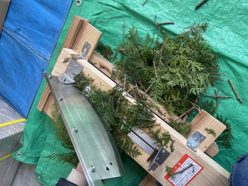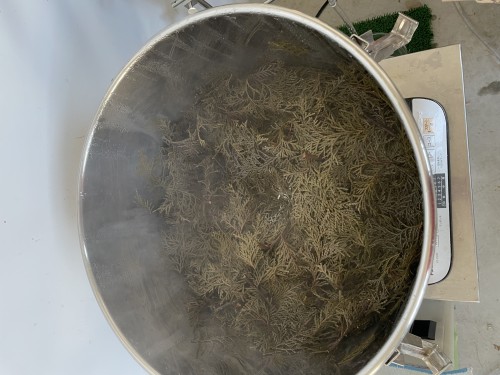 ヒノキ葉、小枝の蒸留。大型カッターで5、6cm程度にカットしてから蒸留釜へ。今回2875gで、釜ふんわり8分目程度。3kg~3.5kgまでは入りそう。