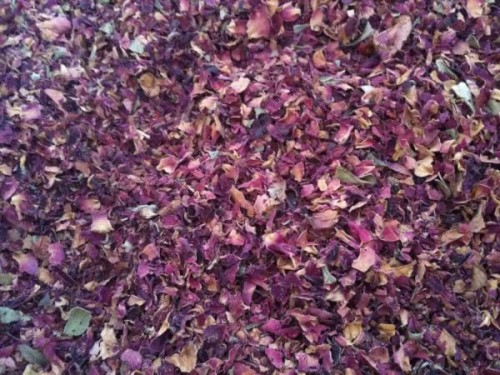 冷凍のダマスクローズ(ガク付)を煮出し蒸留。加水は5L。銅ウールアタッチメントを使用。この程度の量では精油は採れないがローズウォーターは採取できる。ローズの蒸留は銅の使用が有効。
