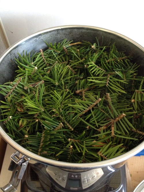 シキミの葉の蒸留。葉は、ハサミで4,5cmにカットしてから蒸留釜へ。精油もとれている。