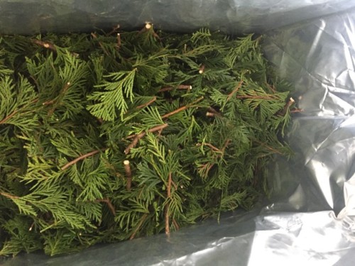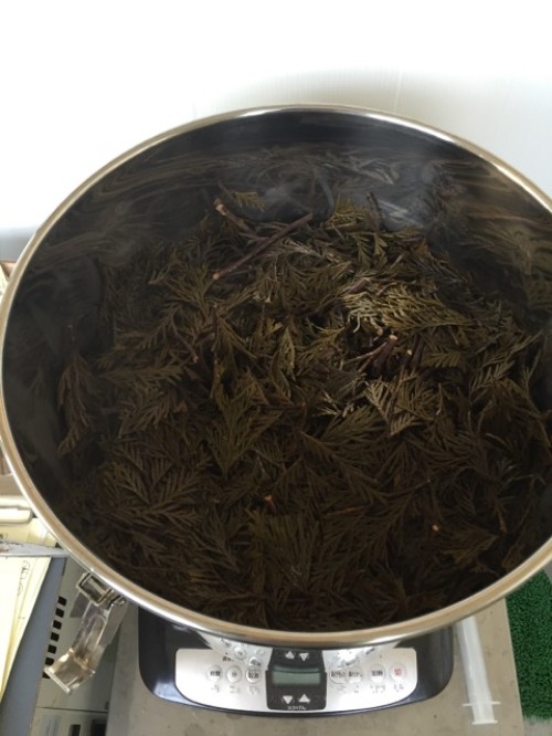 匂いヒバは、ヒノキ科の樹木で、葉っぱをもむとパイナップルの様な香りがします。この良い香りがすることから『匂いヒバ』と呼ばれている。オイルの抽出率も良かった。。