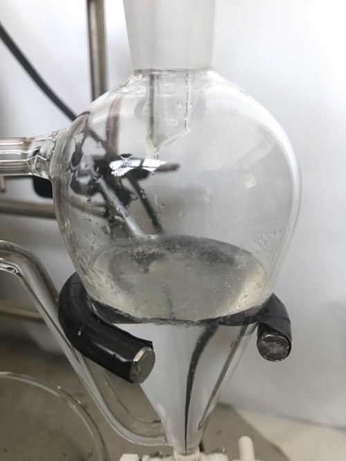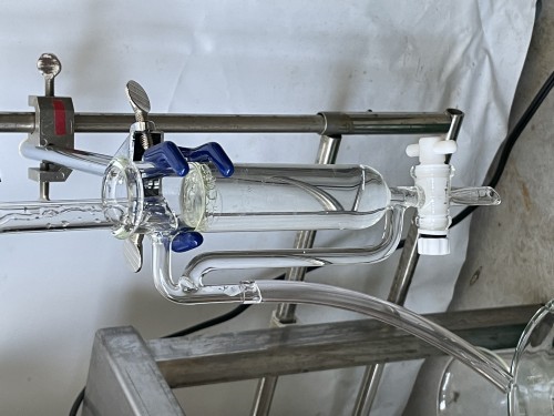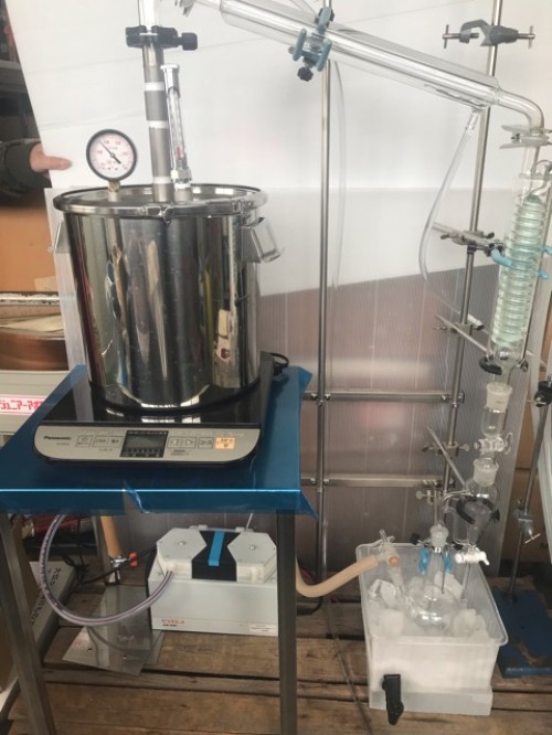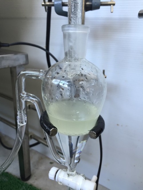 樟脳(クスノキ)の蒸留。4時間。二次冷却槽をガラスで作成。ガラス冷却槽の水位など様子を見ながら実施。2時間まではそのまま続けて実施。徐々に結晶もガラスフタ部分に付着してきた。一旦、2時間経過時にガラス冷却槽を交換し新しいガラス冷却槽と125mlオイルセパレーターを接続し再開実施。3時間経過あたりからまだ結晶が出ていてオイルセパレーターが詰まり 別のオイルセパレーターに交換して4時間まで蒸留した。まだ結晶も有りオイルも少量有りでシャーベット状になった。0~2時間で結晶29.5g。2~4時間でオイル(結晶含むシャーベット状)10mlとれた。0~4時間の抽出率0.61% この後もさらに5時間実施した。9時間total全体で 結晶+オイル44 抽出率0.68%