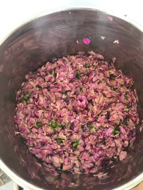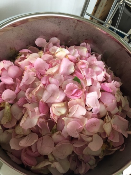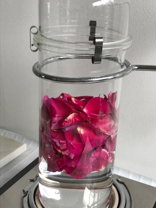 減圧煮出し蒸留。とても良い香り。バラのガクは入れないで花びらだけを採って蒸留釜へ。