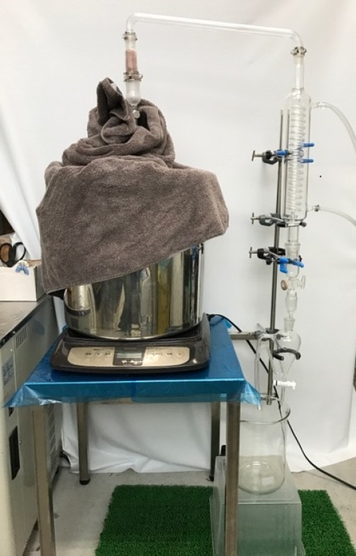 4/1採取された花2500gと予備で3/29に採取された500g ジップロックに入れて送付されたためか花が花の鮮度がおちて茶色になっている。45mlロングオイルセパレーター使用。黄色い精油採れた。少量分析へ。スチーム蒸留。加水6L
