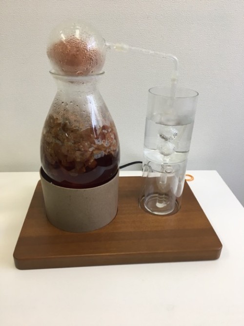 減圧蒸留装置を用いることによって、常圧(大気圧)では100℃で沸騰する水が約40~50℃で沸騰します。 花の香り(ダマスク・モダンの香り)が劣化することなく、ローズウォーターで再現できました!
