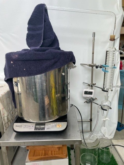 採取したばかりのネロリ(ダイダイの花)を 煮出し蒸留。加水 4L。ネロリはオイルの抽出率が少ないのでロングオイルセパレーターを使用。ロングオイルセパレーターは上部の径が小さいので少量でも上部に溜まりやすく ネロリや月桃、ローズゼラニウムなど精油が少ない材料に適しています。今回は10Lでの蒸留で上部にオイルを確認できました。ウォーターは濃厚な香りです。