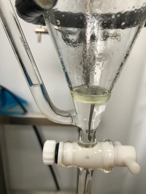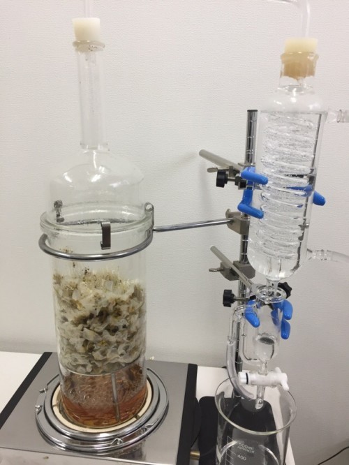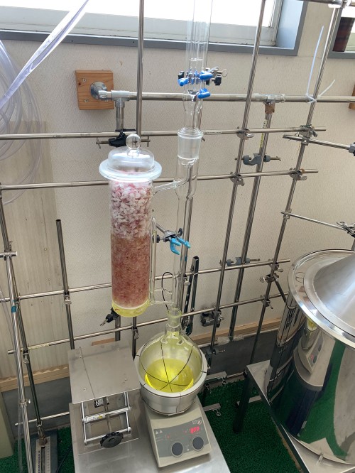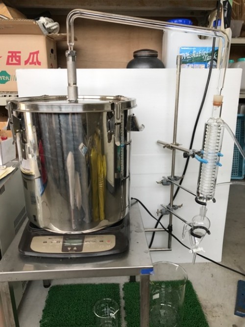 フレッシュのホップのスチーム蒸留。ロングオイルセパレーター使用。毬穂を手で半分に割ってから蒸留釜へ。オイル・ウォーター黄色い。精油は確認できたがオイルセパレーターにくっついてとりわけが困難。香りはかすかに柑橘を感じるさわやかな香り。(以前蒸留したホップの香り(ビールのほろ苦さが感じられた)とは違う。)