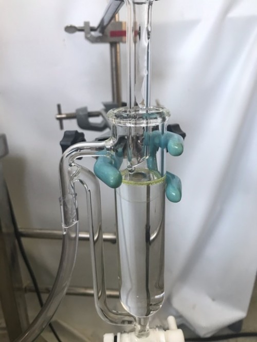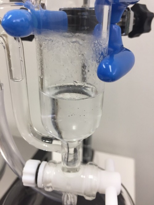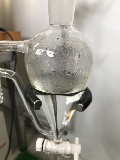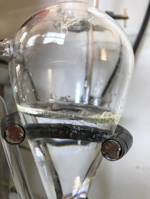 カンラン科の植物 フランキンセンスの木からとれる樹脂(粒状)の蒸留です。フラスコ内を撹拌すためスターラーを使用しピュアスティーラーミニで煮出し蒸留しました。加水は800ml.。透明なオイルが採れました。