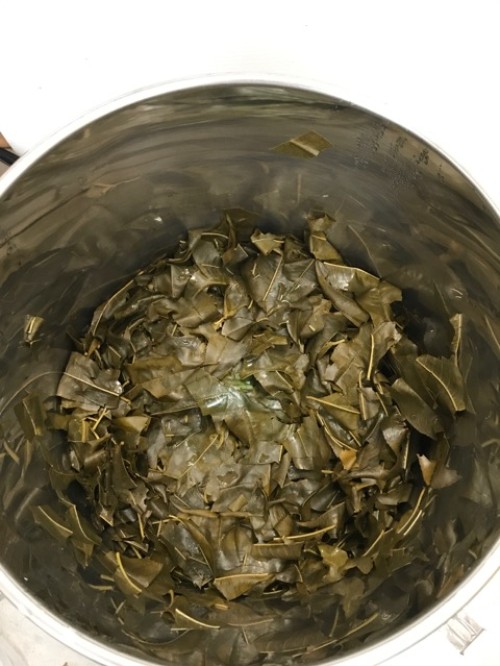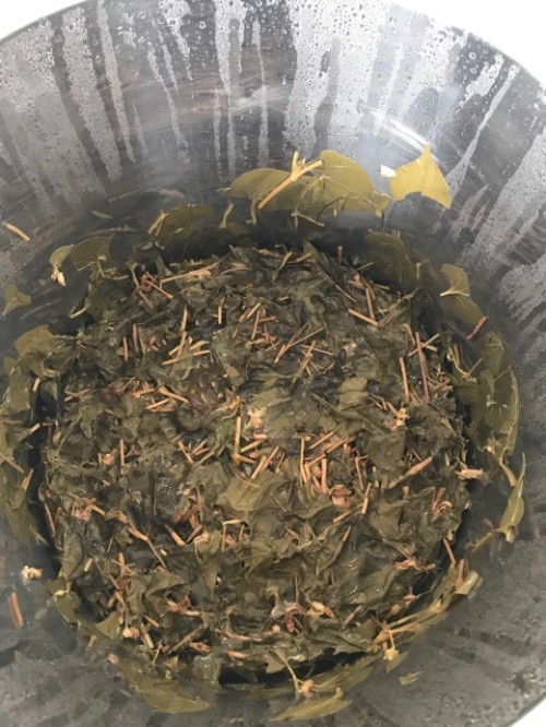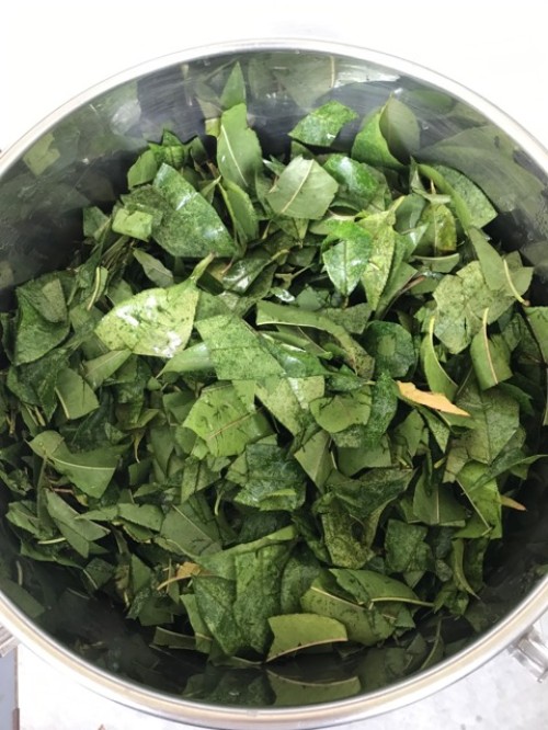 葉をハサミでカットしてからスチーム蒸留をしました。オイルはありませんでしたが蒸留水は杏仁豆腐の様な香りがしました。
