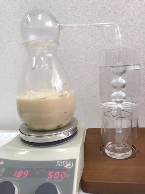採ってきてすぐのサクラの花をLiteでスチーム蒸留。サクラはオイルは採れないが、水に溶けやすい成分ベンズアルデヒド(杏仁の香り)がウォーターでとれる。出始めから3分で取り分けたウォーターは杏仁のとても良い香り。3~30分まではまだ杏仁の香りがする。その後は煮えた香り。