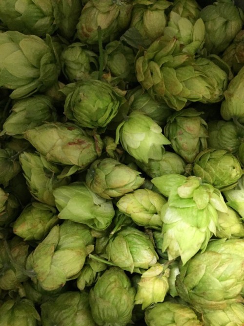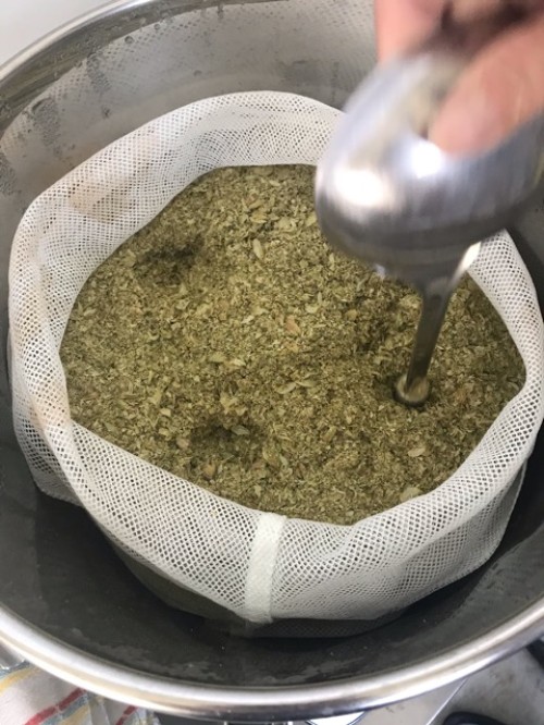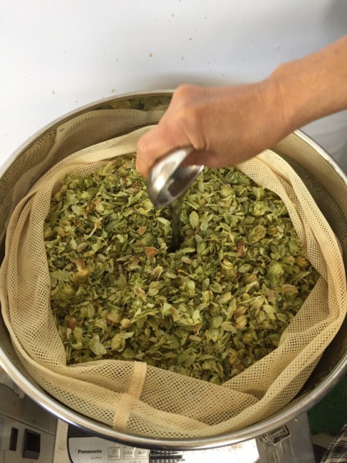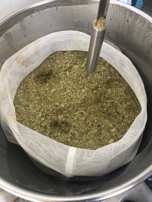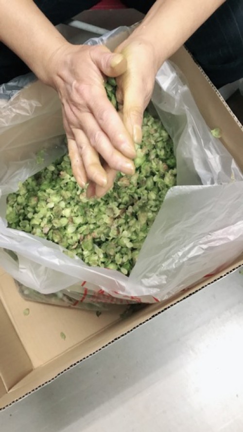 乾燥ホップ。手ですりつぶしてから蒸留釜へ。作業時間1名1時間。蒸気がっとりやすいようにお玉の柄で穴をあける。黄色いオイル。さわやかな香り。